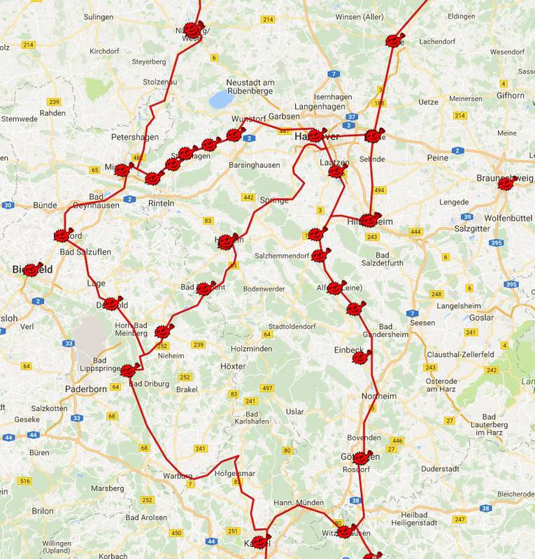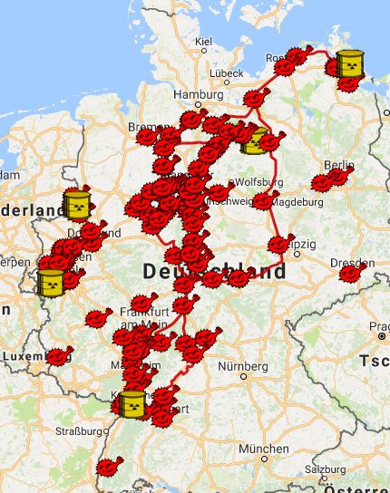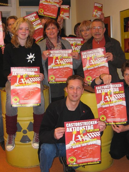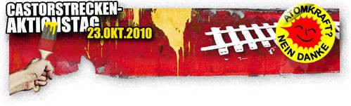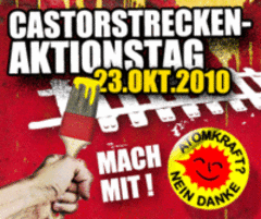Mehr als 20.000 Menschen an über 120 Aktionsorten im ganzen Land beteiligten sich am 23. Oktober 2010 am Castor-Strecken-Aktionstag. Angeregt von Südwestdeutschen Bürgerinitiativen und organisiert von der Arbeitsgemeinschaft Schacht KONRAD und der BI Lüchow-Dannenberg, sollte der Tag möglichst viele Menschen anregen, die Transportgefahren vor der eigenen Haustür in den Blick zu nehmen, zum Aktionsort und öffentlichen Thema zu machen. Die größte Demonstration fand mit 3.000 Teilnehmern in Hannover statt, es gab Demonstrationen, z.B. in Freiburg (1000) oder bei Biblis (500). In Schaumburg fuhren Menschen nach Auftakrtkundgebungen an den S-Bahn-Bahnhöfen nach Stadthagen, wo sich 250 Menschen zu einer Kundgebung trafen, GRÜNE, SPD und Autonome ihre Position darlegten und zu den Castor-Protesten im November im Wendland aufriefen. Und als die Demonstration losgehen sollte, kam doch tatsächlich ein Castor um die Ecke und mußte blockiert werden. In der Folge entstand der Anti-Atom-Bündnis Schaumburg. In Hameln fand erstmals das Rattenscheuchen statt, das dann einige Monate die Gemüter erhitzte. In Alfeld organisierte die Arbeitsgemeinschaft Schacht KONRAD gemeinsam mit dem GRÜNEN Ortsverband eine Kundgebung. Aktive der BürgerAktionSichereAsse (BASA, Kreis Wolfenbüttel), fuhren in ihren genähten Atommüll-Fässern nach Banteln und trafen sich dort mit rund 50 örtlichen Akteuren. Die meisten Aktionen aber wurde von kleineren Gruppen oder Einzelnen durchgeführt: Infostände, Fahrradtouren (z.B. von Bremen an die Strecke bei Nienburg), Streckenbeghungen oder Bahnfahren mit Atommüll-Fässern. Dazu gab es einen Aktionsleitfaden mit vielen Anregungen. An vielen Orten entschlossen sich Aktive kurzfristig oder sogar noch während des Tages, Aktionen durchzuführen und darum ist die Aktionsübersicht nicht ganz vollständig. Die Informationen von den verschiedenen Orten wurde im KONRAD-Haus in Salzgitter zusammengetragen, unmittelbar getickert und an die Presse weiter gegeben.