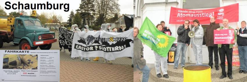 "An fünf Bahnhöfen haben sich die Kernkraftgegner um 11.55 Uhr entlang der Bahnstrecke Wunstorf – Minden, eine der möglichen Strecken des Castor-Transportes, versammelt, um gegen die geplanten Atommüll-Transporte sowie die Laufzeitverlängerung der Atomkraftwerke zu demonstrieren. Im Anschluss kamen rund hundert Demonstranten aus dem Landkreis vor dem Stadthäger Bahnhof zu einer Abschlusskundgebung zusammen", heißt es im Bericht der Schaumburger Nachrichten. "Zum Abschluss rief Strempel dazu auf, den Stromanbieter zu wechseln, um die „vier großen Konzerne“ nicht zu unterstützen. Außerdem apellierte er, gemeinsam zu den Protesten nach Dannenberg am 6. November zu fahren."