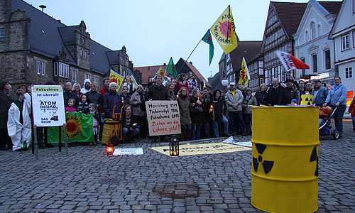 Hameln: Spontanes Gedenken am Tag nach der Katastrophe im Münster, eine erste Mahnwache dann am 21. März mit 300 TeilnehmerInnen und eine zweite mit 200 am 28. März. Das Anti-Atom-Plenum Weserbergland rief mit zur Demonstration am 19. März in Hannover (10.000 TeilnehmerInnen) auf und konzentrierte sich im weiteren auf die für den 25. April geplanten Großaktion am AKW Grohnde und weitere Standortaktionen 2011 und 2012. (siehe auch detailliert: Mahnwachen Hameln)