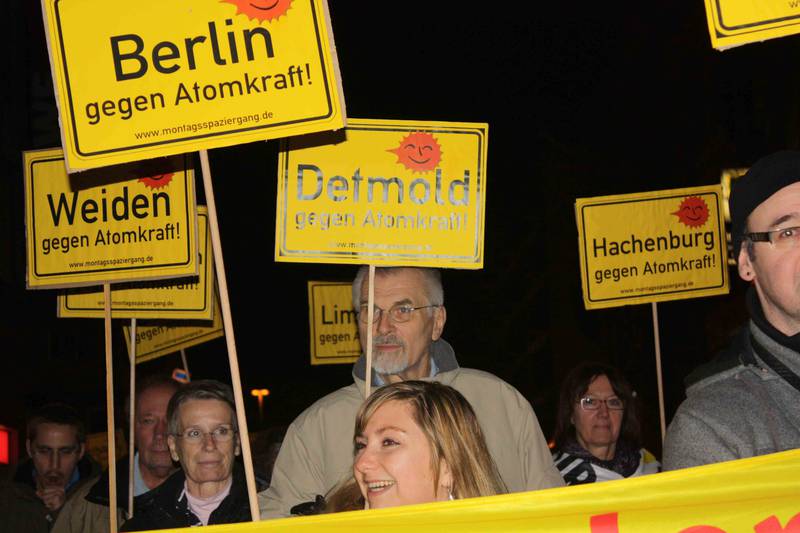 Am Montag, dem 14. März 2011 beteiligten sich mehr als 100.000 Menschen an mehr als 450 Orten in Deutschland an ersten Fukushima-Mahnwachen. Sie knüpften nahtlos an die Tradition der Montags-Spaziergänge gegen Atomkraft* an, die seit Mitte 2010 in vielen Orten stattfanden, z.B. in Detmold und Lage im monatlichen Wechsel oder an regelmässige Aktionen, wie das Rattenscheuchen in Hameln. Zum Teil wurden sie spontan örtlich initiert, z.T. folgten sie dem Aufruf von .ausgestrahlt (damals noch „Mitmach-Kampagne“), die in der Folgezeit auch versuchte, die TeilnehmerInnenzahl zu erfassen und abzubilden. Für den 2. Montag nach Fukushima konnte .ausgestrahlt sogar rund 142.000 Menschen an 726 Orten am 21. März vermelden. Mit sinkenden TeilnehmerInnenzahlen gingen die Mahnwachen vielerorts zumindest bis zum Sommer wöchentlich weiter, z.T. auch darüber hinaus. Nach und nach dünnten sie aus, fanden monatlich statt oder gar nicht mehr. In einigen Orten, z.B. Göttingen und Wolfenbüttel, blieben monatlich Mahnwachen eine regelmässige Aktionsform, in vielen Orten finden sie jährlich zum Fukushima-Jahrestag statt.