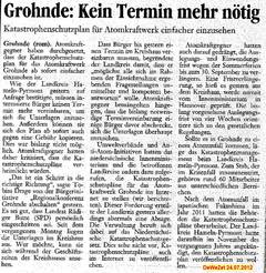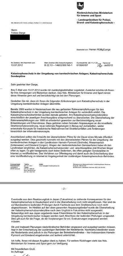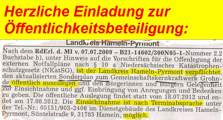 Für die Zeit vom 18. Juli - 17. August wurde die "Offenlegung der externen Notfallpläne" für die Kreise rund um das AKW Grohnde und ab 23.07. dann auch das AKW Lingen angekündigt. Dazu verpflichtet waren die Behörden, weil Änderungen im Niedersächs. Katastrophenschutzgesetz von 2009 in die örtlichen Pläne umgesetzt worden waren. Aktuelle Erkenntnisse aus Fukushima wurden nicht berücksichtigt. [Schreiben des Nieds. Innenministeriums vom 26. Juli 2012]. Bevor eine sachliche Auseinandersetzung möglich war, mußten gegen die Behörden allerdings erstmal elementare Formen der Öffentlichkeit durchgesetzt werden. Die Pläne erwiesen sich dann als hoffnungslos veraltet, widersprüchlich und nicht durchführbar, die Behörden hoffnungslos überfordert, wie die KritikerInnen am 15. August vor der Landespressekonferenz in Hannover berichteten [Geisterzüge im Flickenteppich]. Dass Initiativen und Verbänden verweigert wurde, beobachtend an einer Stabsrahmenübung im November im Kreishaus in Hameln teilzunehmen und die Medien mit Vorführungen bespielt wurden, komplettierte das Bild. In einem Brief an die Innenministerkonferenz im Dezember in Rostock forderten die KritikerInnen realistische Übungen im Umkreis von 170 KM unter einbeziehung der Bevölkerung.