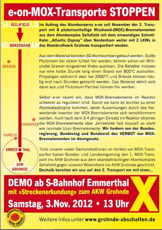 Quelle: henryDT91 Am 12.11.2012 veröffentlicht. Text: Demo gegen den Transport von Plutoniumhaltigen MOX Brennelementen aus der Atomanlage in Sellafield zum AKW Grohnde in Niedersachsen.