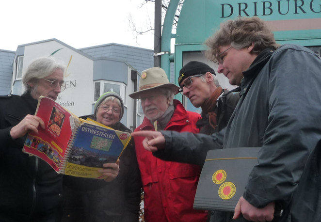 | Am 5. Januar haben wir uns die Strecke von Detmold bis Bad Driburg angesehen. In der Karte (s.u.) sind in blau einige Orte markiert, an denen wir uns die ersten Streckenpunkte wünschen. - was ist ein Streckenpunkt? - Natürlich geht das auch an anderen, selbstgewählten Orten entlang des Streckenabschnittes und natürlich passen auch noch viele weitere Streckenpunkte zwischen die blau markierten Vorschläge. |
