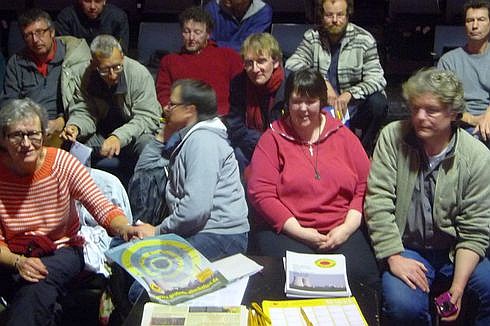 Ca. 45 Streckenposten und Multiplikatoren verteilen die Aufgaben. Peter Dickel von der AG Schacht Konrad gibt einen Gesamt-Überblick rund um das angenommene Katastrophengebiet und stellt Plakate und weitere Materialien (Grohnde-Zeitung, Postkarten) vor.