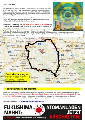 Zum 2. Fukushima-Jahrestag planen wir rund um das Atomkraftwerke Grohnde eine spektakuläre Aktion, wie es sie in Deutschland noch nicht gegeben hat: Mit einer Aktions- und Menschenkette wollen wir im Abstand von etwa 40km vom Reaktor zeigen, welches Ausmaß eine Katastrophe wie Fukushima in Deutschland haben könnte und die Stilllegung der noch laufenden Atomanlagen fordern.