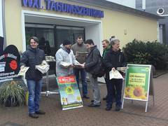 Zur Mobilisierung der Aktions- und Menschenkette am 9. März anlässlich des 2. Fukushima-Jahrestages. Für einen Stand der Grohnde-Kampagne innerhalb der Parteitagsgeländes hatte die beiden Parteien leiden keinen Platz.