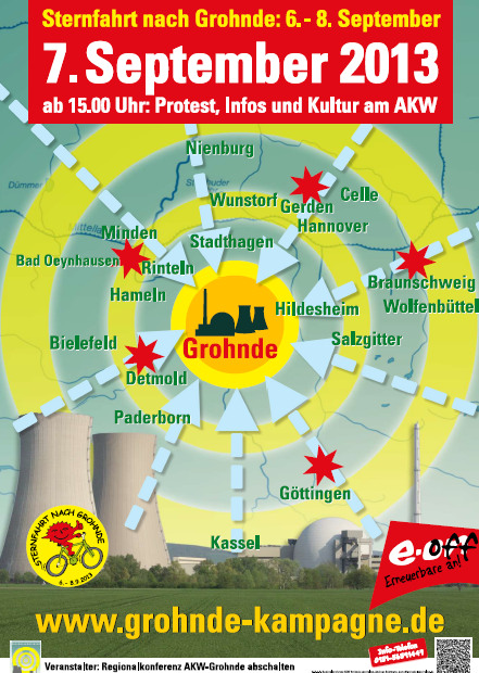 Mehr als 20.000 Menschen haben am 9. März 2013 im Rahmen einer Aktions- und Menschenkette rund 40 KM um das AKW-Grohnde gezeigt, wie eine Atomkatastrophe in unser Leben eingreifen würde. Viele Menschen sind sich dabei bewusst geworden, wie nah sie der Katastrophe sind. Am 7. September kamen, nach bis zu 100 km Protest-Fahrrad-Tour, nun Menschen nach Grohnde, um sich vor Ort selbst ein Bild zu machen.