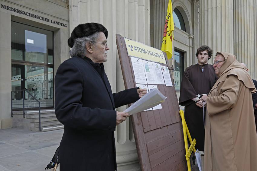 "Falsches benennen und Richtiges fordern" - unter diesem Motto nagelten die Initiativen niedersächsischer Atom-Standorte vor dem Landtag in Hannover zum 500sten Jahrestag der Reformation Thesen und Forderungen an eine Holztür - ganz im Stil Luthers.