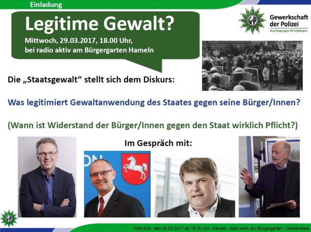 Die Bezirksgruppe Hameln-Pyrmont der Gewerkschaft der Polizei nimmt die Ausstellung 40 Jahre "Schlacht um Grohnde" zum Anlass und lädt in Kooperation mit dem Lokalsender radio aktiv in dessen Räume am Bürgergarten in Hameln zu einer Gesprächsrunde ein.
