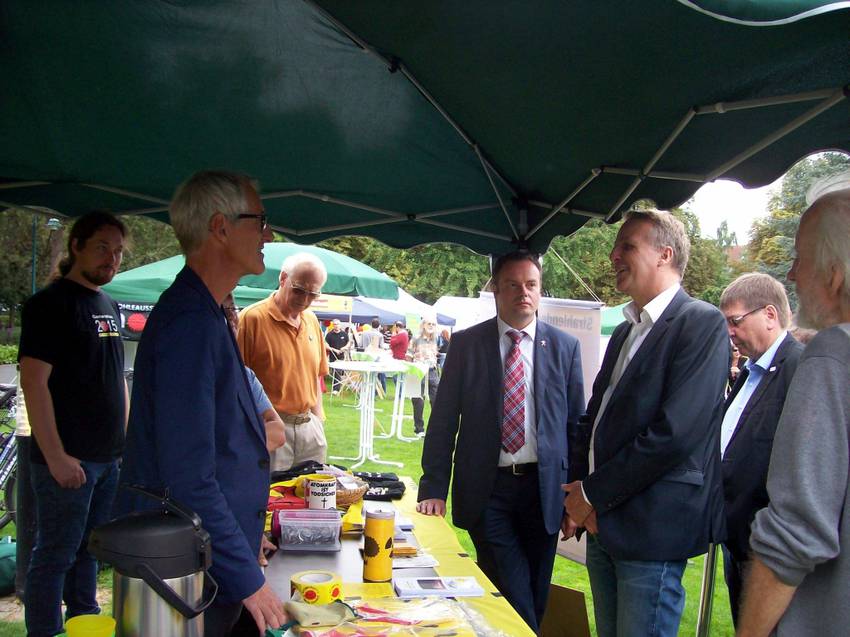 (15.9.15/KS) Am Stand des Anti-Atomplenums Weserbergland und des Rechtshilfefonds auf dem Tag der Umwelt am vergangenen Sonntag in Hameln kam es zu einem Gespräch mit Niedersachsens Umweltminister Wenzel. Auf die Frage, welche Ergebnisse das Bund-Länder-Gespräch in Berlin Ende August erbracht habe, machte er deutlich, dass diese sich momentan in der Auswertung befänden, ein Zeitpunkt für deren Abschluss noch nicht genannt werden könne und somit Unklarheit bestehe, ob ein Bescheid zum laufenden Anwohnerantrag fristgerecht von seinem Haus erstellt werden könne.