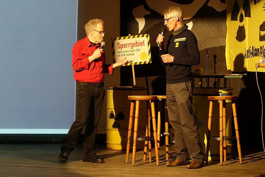 Die Veranstalter hatten die Form einer Interviewrunde gewählt: Hans-Peter Leiding (Grohnde) als Kläger und Karsten Schmeißner (Detmold) vom Rechtshilfefonds Atomerbe Grohnde e.V. standen der Moderatorin Claudia Staubach Rede und Antwort.