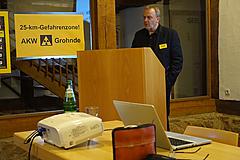 In einen kurzen Einführung in das Thema durch Dr. Heinrich Horstmann (s. Foto), Mitglied im AK Atomausstieg, übernahm anschließend Meinolf Haase als oberster Katastrophenschützer die Regie. Während seiner engagiert vorgetragenen Ausführungen (Präsentation zum Thema "Gefahrenabwehrplanung bei einem kerntechnischen Unfall") entwickelte sich im Laufe des Abends – zusammen mit den zahlreichen Zwischenfragen der Zuhörer – ein intensiver Dialog.