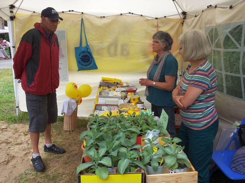 Das zeitweise recht nasse Wetter war nicht unbedingt von Nachteil, weil etliche Besucher bei Regen im Infozelt Schutz suchten. So kam es zu manchen intensiven Gesprächskontakten, bei denen auch Infomaterial zur Klage und zu anderen atomkritischen Themen unters Volk gebracht wurde. Dabei konnte vielfach an die Anfang Juni erfolgte Verabschiedung der Grohnde-Resolution durch den Salzufler Rat angeknüpft werden.