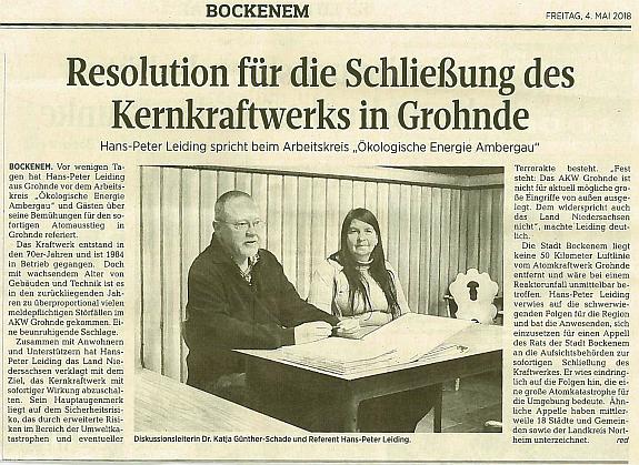 (18.05.18/GS) Der Arbeitskreis "Ökologische Energie Ambergau" aus Bockenem hatte Kläger Hans-Peter Leiding eingeladen, um am 26. April (Tschernobyl-Jahrestag!) über die laufende Klage gegen die Betriebsgenehmigung des AKW Grohnde zu berichten. Unter dem Titel "Resolution für die Schließung des Kernkraftwerks Grohnde" berichtet darüber der Seesener Beobachter – Ausgabe für Bockenem – am 4. Mai 2018: