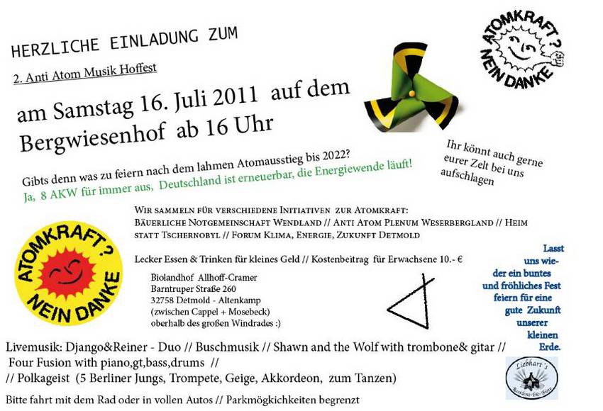 (21.07.11/Sg) Ein vergnügliches Anti- Atom- Musik Hoffest fand am letzten Samstag auf dem Bioland Bergwiesenhof zwischen Hameln und Detmold statt.Auf der Hinfahrt schlängelten wir uns durch die sanften Hügel des Weserberglands, zwischen dem sattem Grün der sommerlichen Wiesen, dem sandigen Gelb reifender Ähren, vorbei an lichtdurchfluteten Eichenwäldern und Alleen mit silbrig wehenden Birken. Und das keine zwei Stunden von Braunschweig entfernt. Ich mache keinen Hehl aus meiner Begeisterung für diese wunderschön geschwungene Gegend. Der Bergwiesenhof konnte sich nicht idyllischer zeigen, ganz oben auf einer Bergkuppe gelegen, mit einem phänomenalen Blick ins Tal und über die Weite der Landschaft. Einsam und wunderschön. Bei unserem Eintreffen waren alle noch eifrig dabei den Hof mit Birkenzweigen zu schmücken und die letzten Aufbauten für das Fest zu gestalten. Nach herzlicher Begrüßung durch den Gastgeber und dem Duft von würzigem Heuballen in der Nase, zogen wir uns in das kühle Innere des Hauses zurück. Denn bevor es für uns Feiern hieß, hatten wir noch einiges zu besprechen. Das Grohnde- Treffen stand auf der Tagesordnung. Aus verschiedensten Städten der Region waren Aktive [Homepage Bündnis Ostfahlen Lippe] zum Gespräch eingetroffen. Die Bielefelder hatten passend zum Thema AKW Grohnde ihren neusten, sehr gelungenden Flyer mitgebracht, der das Baujahr des AKWs Grohnde thematisiert.