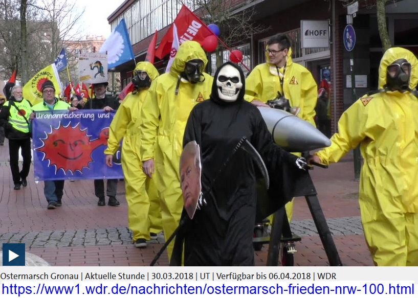 (So. 01-04-18) Dass die diesjährigen Ostermärsche am Karfreitag um 13.00 Uhr im westfälischen Gronau begannen, war kein Zufall. 250 Menschen demonstrierten nach einer Auftaktkundgebung am Bahnhof zur Urananreicherungsanlage. Und die ist eine entscheidende Schnittstelle zwischen der zivilen und der militärischen Atomtechnik. Den Anteil an spaltbarem Uran deutlich zu erhöhen, war eine der fundamentalen Voraussetzungen für den Bau der ersten Atombombe in den USA 1945, also lange bevor es um Atomstrom ging. Zwar muss dass Uran für Bomben deutlich höher angereichert werden als für Brennelemente, aber grundsätzlich gilt: Wer über die Technik verfügt, kann beides. Und was dem Iran in den letzten Jahren unterstellt wurde, dass ein ziviles Atomprogramm lediglich den Zugriff zur Bombentechnik kaschieren solle, gilt natürlich auch für andere Staaten, etwa die Bundesrepublik. Umso pikanter, dass ausgerechnet diese Anlage trotz Atomausstieg unbefristet weiter betrieben werden darf. WDR aktuell berichtete über die Demo und den aktuellen Streit um die Stilllegung.