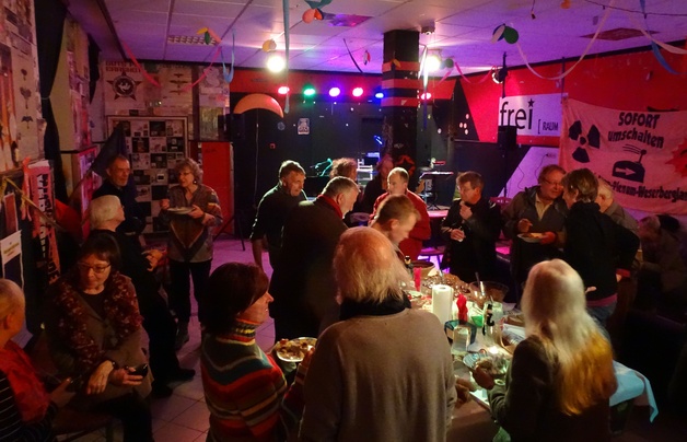 (Di. 16-01-2018/DK) Knapp 40 Mitstreiter/innen auf der 3. Anti-Atom-Party im freiRAUM Walkemühle genossen ein tolles Mitbring-Buffet und ein wunderbar aufgelegtes Musik-Ensemble mit Bob Dulas, Toto Jürgens und dem Flötenspieler "Fludo" Oppermann, das in 3 Blöcken und mit Extra-Zugaben das Publikum grandios unterhielt. Davor und zwischendrin tauschte man/frau sich aus mit Gleichgesinnten im Durchschnitts-Alter 55+ (einige Zeitzeugen der "Schlacht um Grohnde" von 1977 waren damals im Kindes- oder Jugendalter) über zurückliegende oder geplante Anti-Atom-Aktionen.